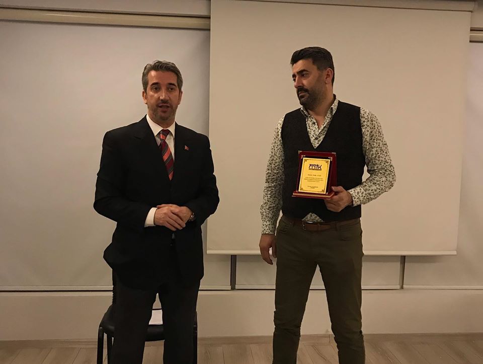 Eğitim sonunda Sayın Sedat Anız' a ATİK Derneği adına sağlamış olduğu katkılardan dolayı teşekkür nezaketi olarak plaket takdim edildi.